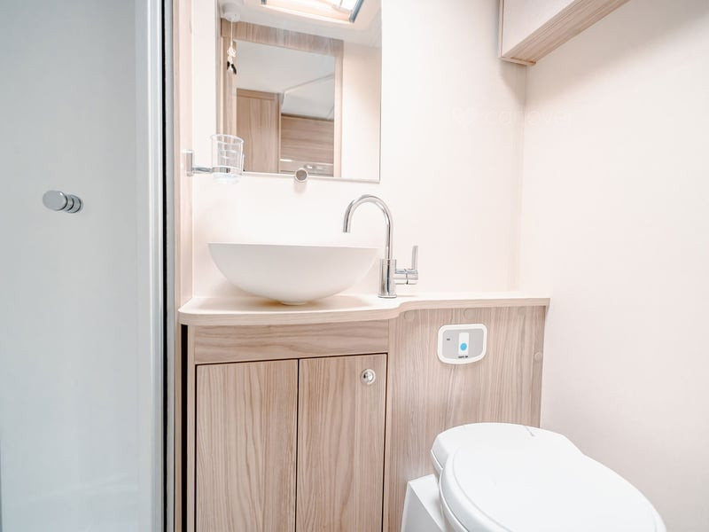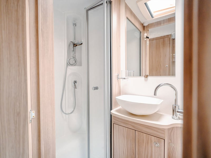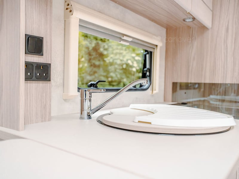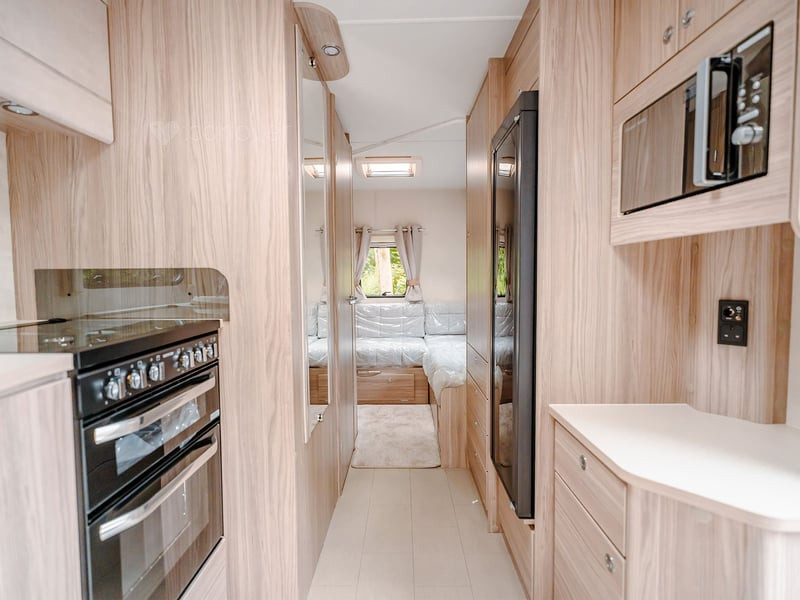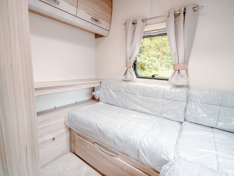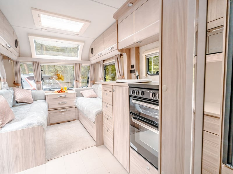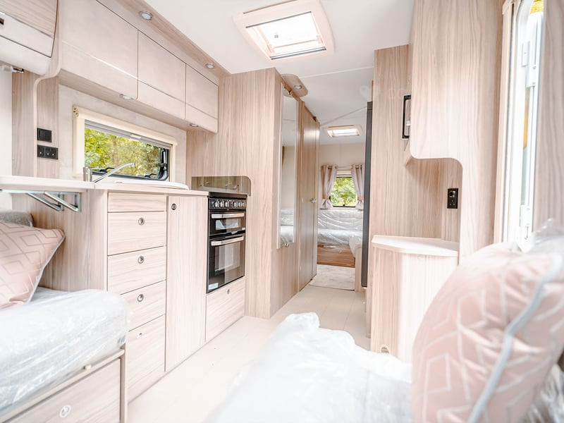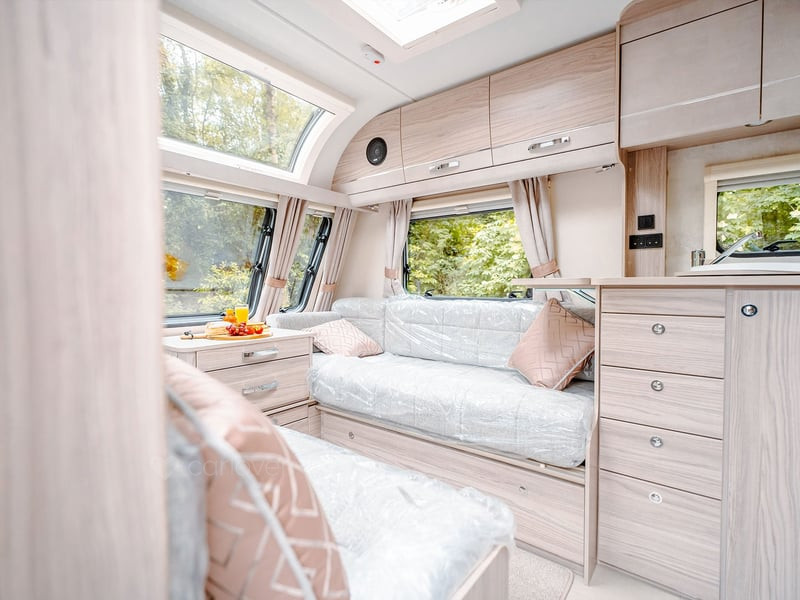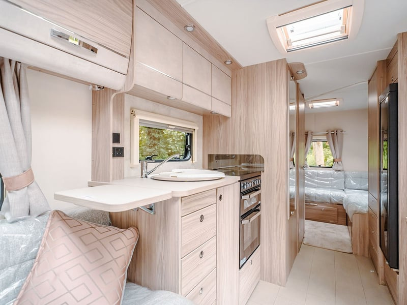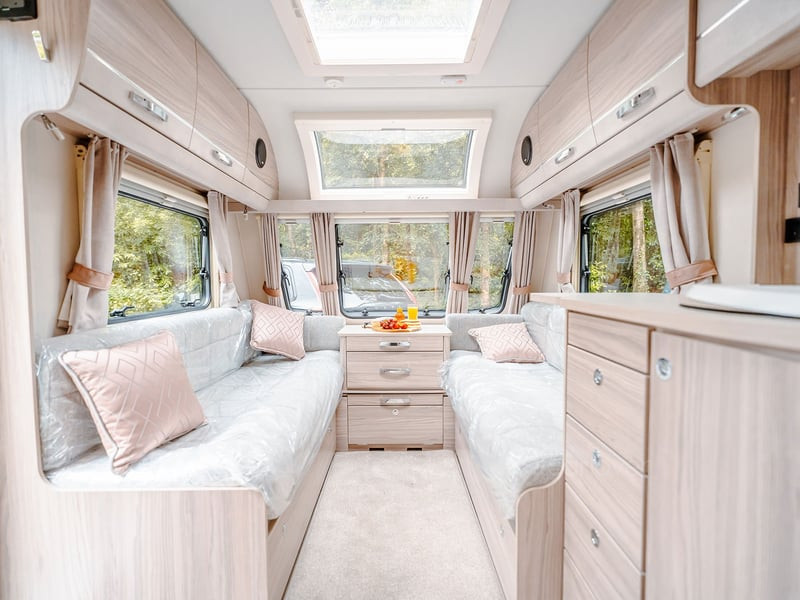 Stunning panoramic Sky-Scape sunroof giving a flood of natural light into the front dinette, with internal LED ambient lighting and pleated night blind